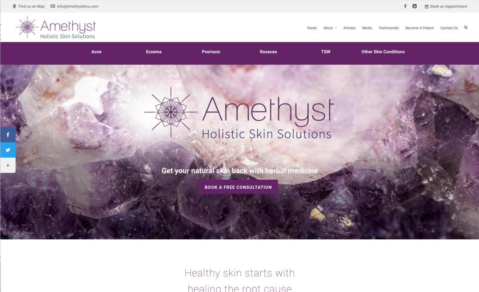 Amethyst Holistic Skin Care had an established logo and mark. However website design included style and mood setting for the entire brand. Website design included image selection and photoshop work with existing photography. Website development included integration with software for client management, scheduling, and other marketing services.